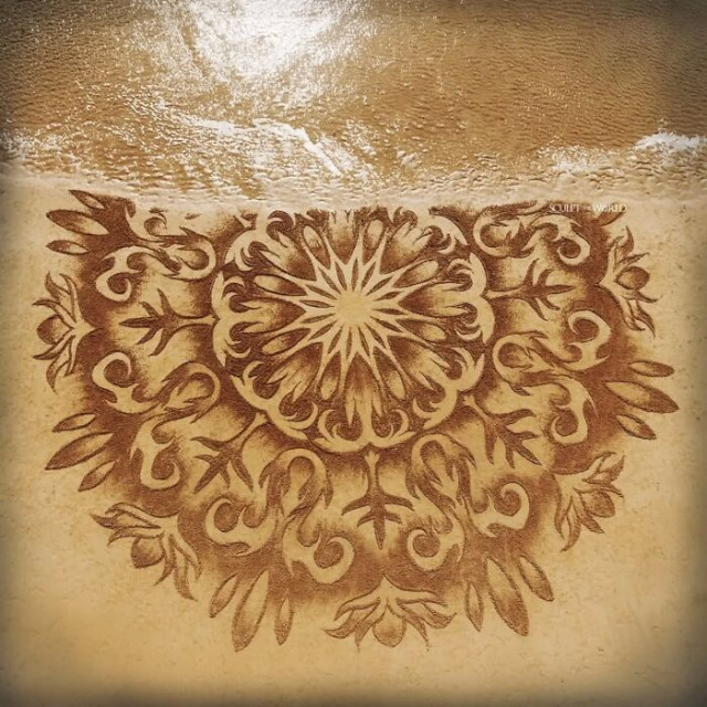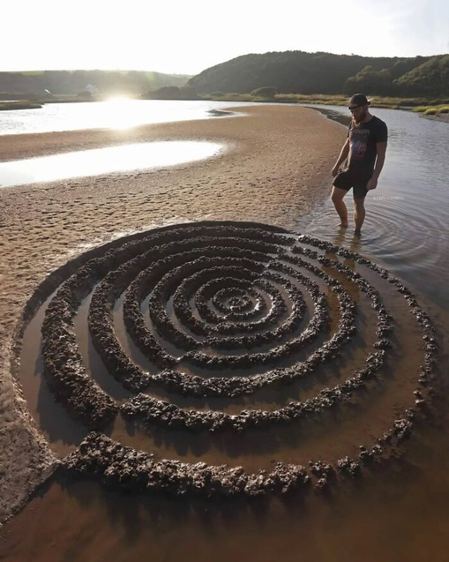 С помощью этих простых материалов он создаёт удивительные композиции: спирали, волны, геометрические узоры, которые кажутся неотъемлемой частью окружающего пейзажа.