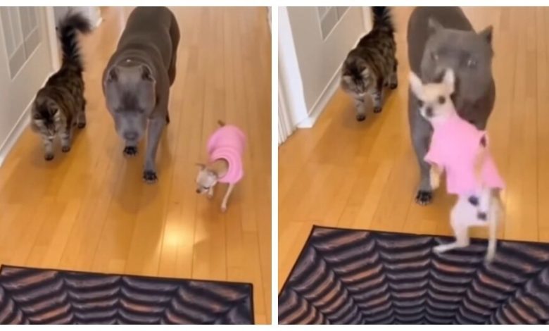 На видео кошка и две собаки стоят перед ковриком с 3D-рисунком, создающим эффект «пропасти». Большая собака решает своими методами выяснить,…