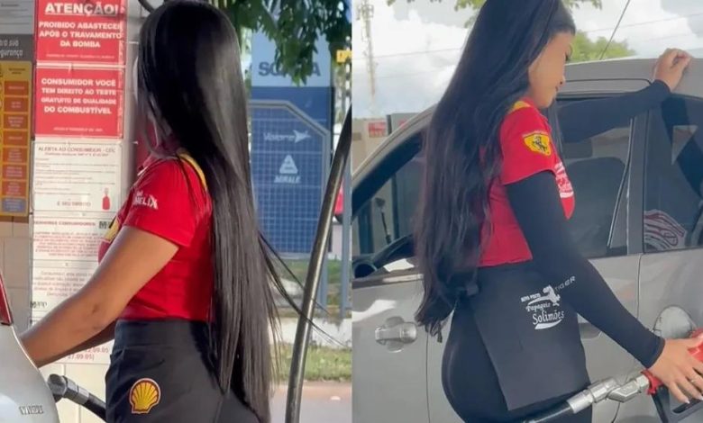 На заправке молодая сотрудница с эффектной фигурой выполняет обычную работу, но её внешний вид сразу привлёк внимание клиентов. На заправке…