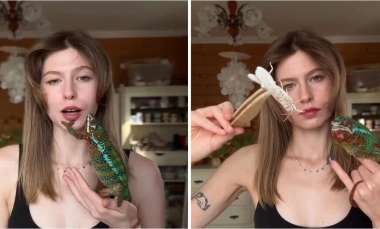 Блогерка показала своего нового питомца — хамелеона по имени Опездол. В видео она рассказывает, что он может раздуваться, напоминая «парней…