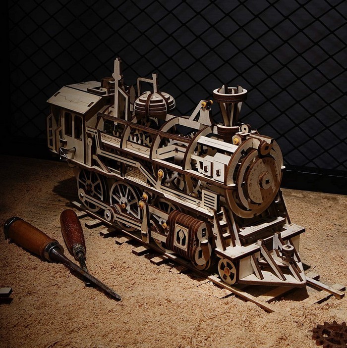 Конструктор из дерева модель паровоза. Состоит из 170 деталей, время сборки около 6 часов. ссылка на источник.